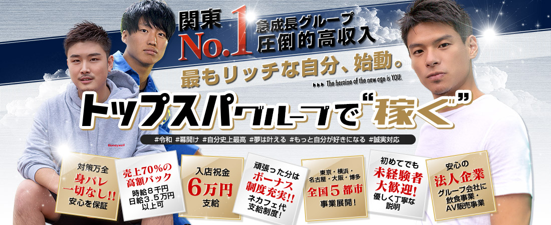 - トップスパ東京は男性のお客様向けオイルマッサージ店になります。 主に20代~40代の男性へのリラクゼーション・性感リフレッシュを目的としたオイルトリートメントを全裸で施術します。お客さまに官能的で気持ちのよい癒やしを提供するお仕事です。 ※未経験者の方も、プロマッサージ師によるマンツーマンの丁寧な講習があるので安心してしっかりマッサージを学べます! ※売り専ではないため、本番(アナルセックス)をしたり、キス・フェラの行為は一切ありません。